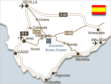Verlassen Sie das Flughafengelände Richtung Jerez über die A4. Nach ca 2,5km verlassen Sie die A4 Richtung A-382 Arcos (de la Frontera). Folgen Sie den Schildern bis zur Abfahrt A-382. Folgen Sie der A-382 ca 27km bis Arcos (de la Frontera). Dort geht die Autobahn in eine normale Straße über, A-384. Folgen Sie dieser Richtung Antequera 26km (bis ca 6km hinter Villamartin). Nutzen Sie die Ausfahrt Prado del Rey/ Ubrique auf die CA-8101. Nach 1,5km befindet sich unsere Toreinfahrt auf der linken Seite.